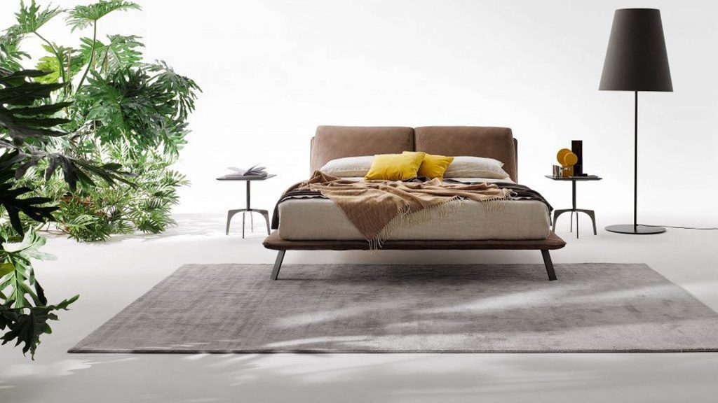 The refinement of the Kanaha bed is given by the multiplicity of materials used. The metal feet blend with the slender upholstered bed frame, creating a bed with an unmistakable style.