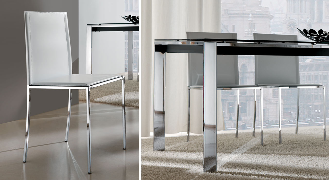 Alice is a metal chair with a strong but elegant character, thanks to the chromed steel frame with very slender square legs. The seat and backrest are covered in full-grain leather.