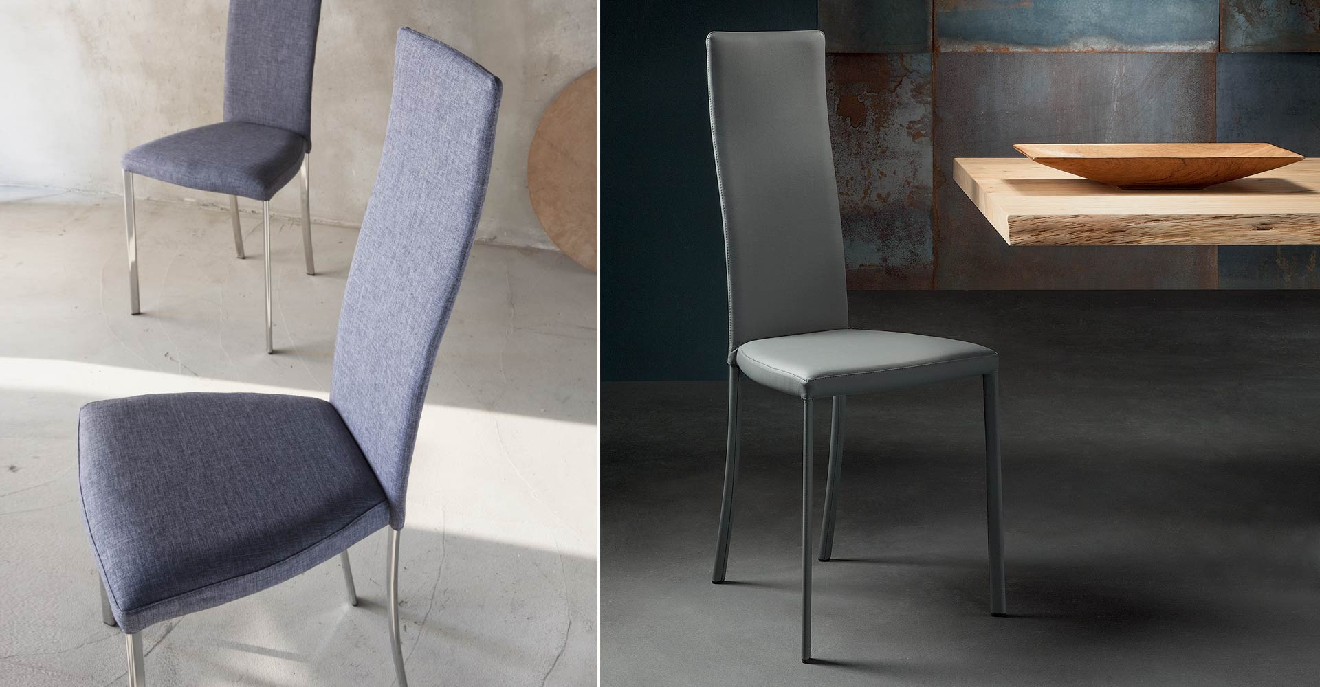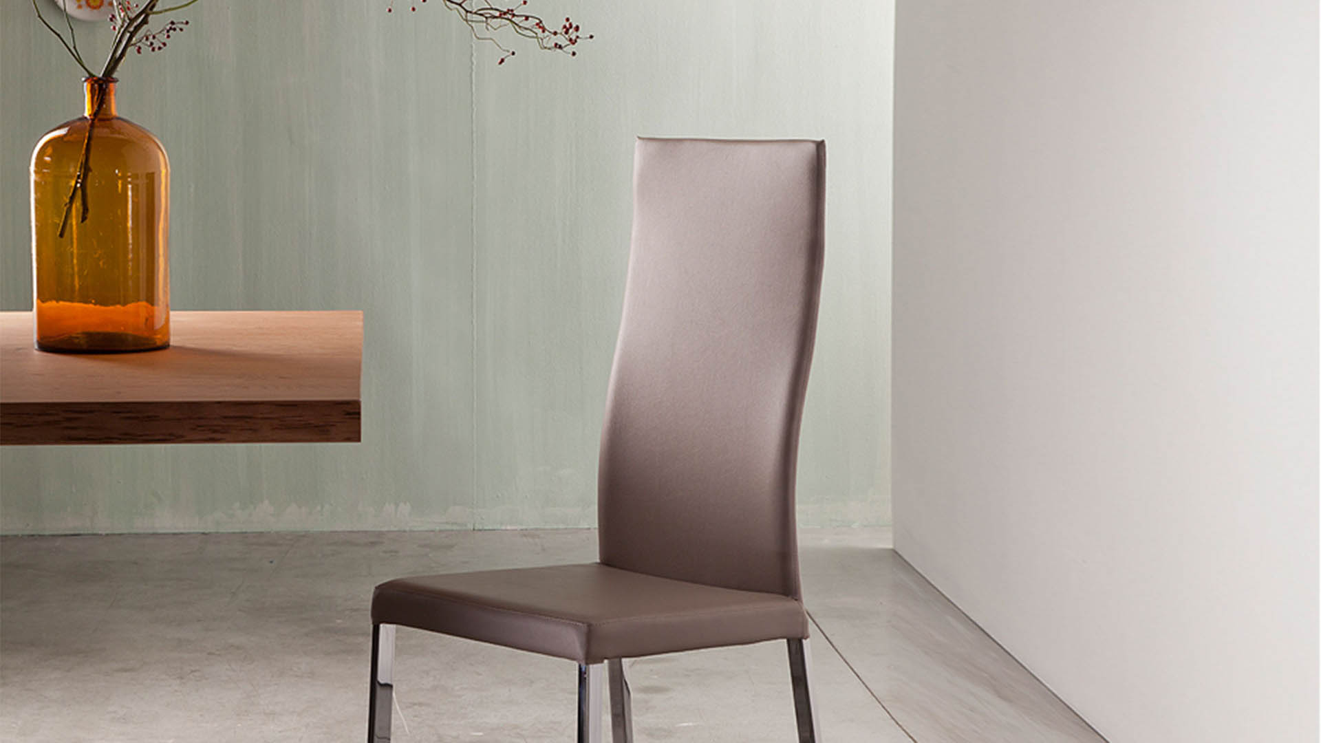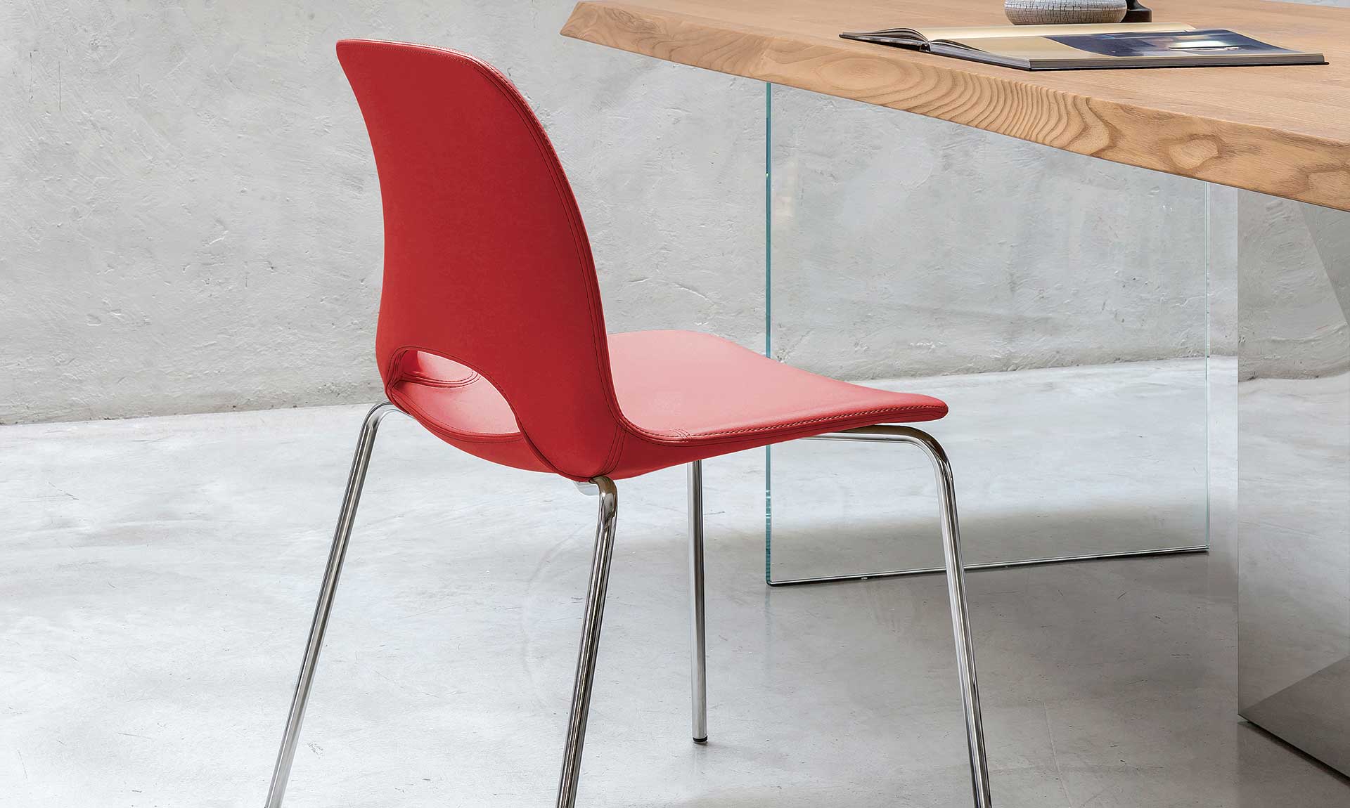 Chair with steel frame, covered in full-grain leather, eco-leather, eco-nubuck, fabric, wool or leather. With chrome legs, coated or painted: graphite, white or RAL colours. The high and ergonomically shaped backrest guarantees a high level of comfort.