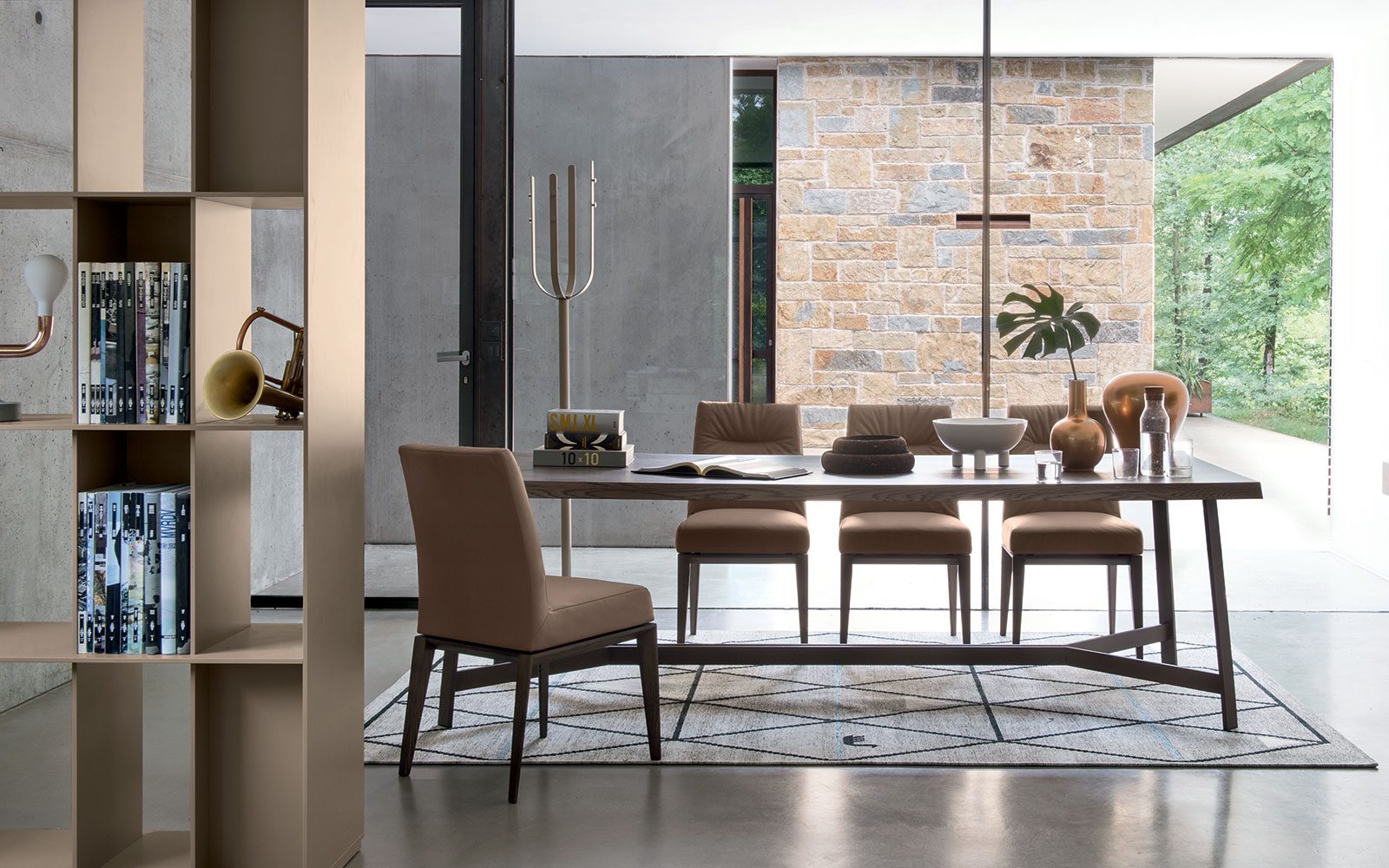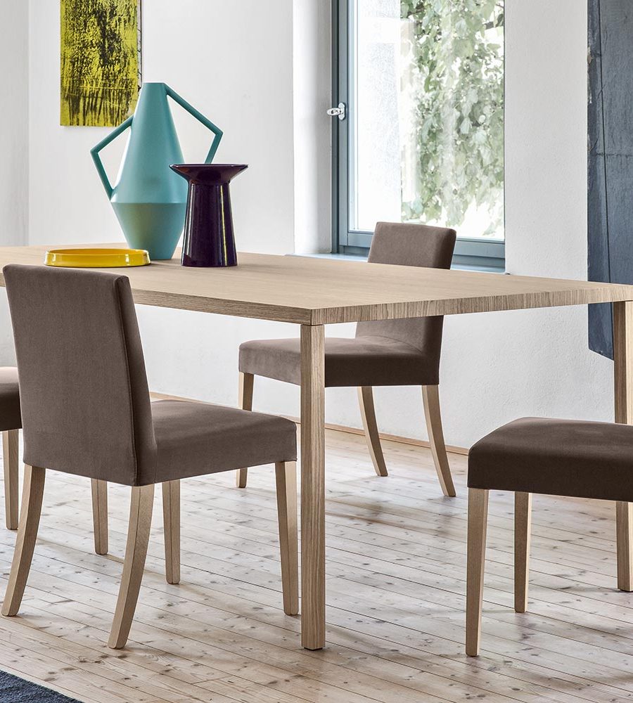 BESS has a solid wood structure, upholstered seat and high back. Choice of upholstery in fabric, imitation leather or real leather. The legs and sides of the structure are solid wood and have an almost triangular, faceted shape. The seat is made with elastic straps. Completely padded, to offer greater comfort, the seat is available with fabric covering, including an anti-stain and anti-bacterial treatment, in GUMMY, a synthetic material easy to clean, soft and smooth to the touch, or in real leather.