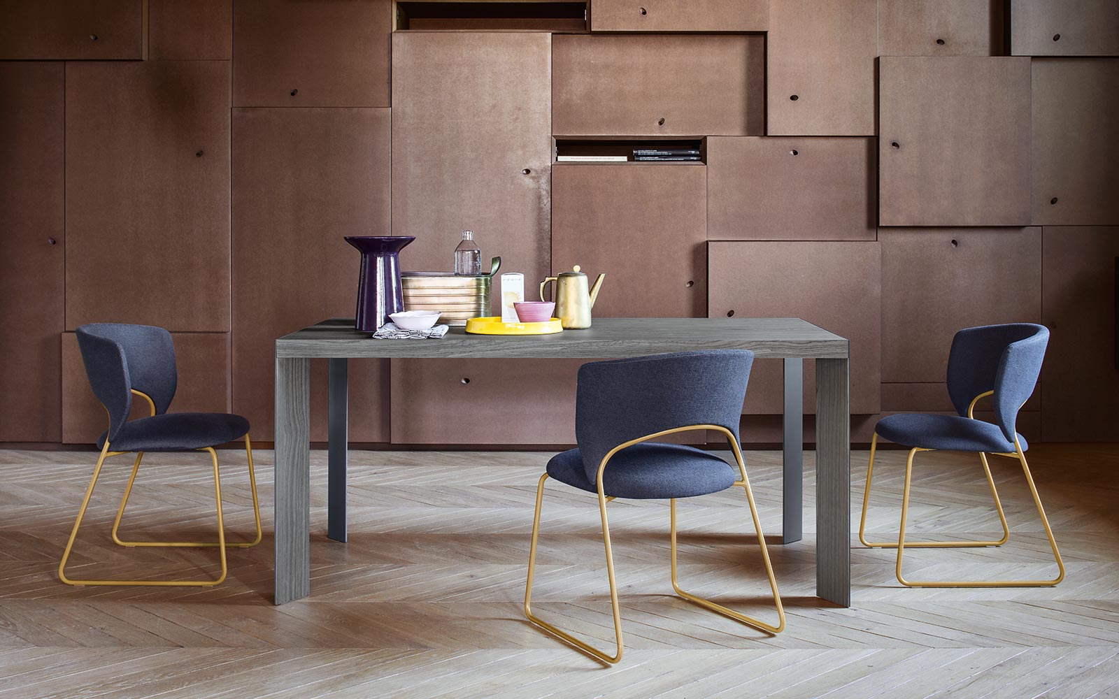 The Mavi chair in fabric has a particular and captivating design with a flap on the back that underlines its elegant and contemporary style. Available with or without armrests; it has a steel structure covered with a cushion on the seat and backrest. Pink, graphite or white gold legs.