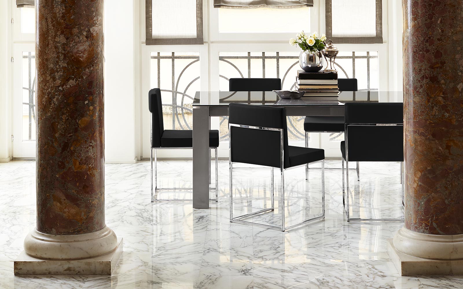 The frame is made of tubular steel with a square shape, flush with the backrest, while the shaped seat is padded and upholstered in genuine leather. Four shock-resistant plastic supports under the base. Chair with great comfort and ergonomics, linear and elegant design, suitable to complete the decor of the dining room or the waiting room.