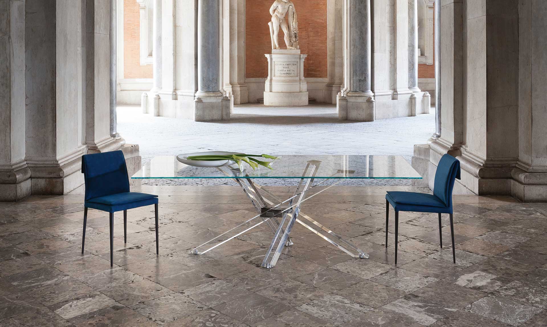 The use of the tubular steel with a small diameter, made it possible to create a light and resistant chair. The sled-shaped base rests on four plastic shock-absorbent supports in a neutral color. The back is joined to the structure thanks to an accurate interlocking system, with invisible fixing points. The rounded lines of the upholstered seat guarantee a high level of comfort and give an added aesthetic value.