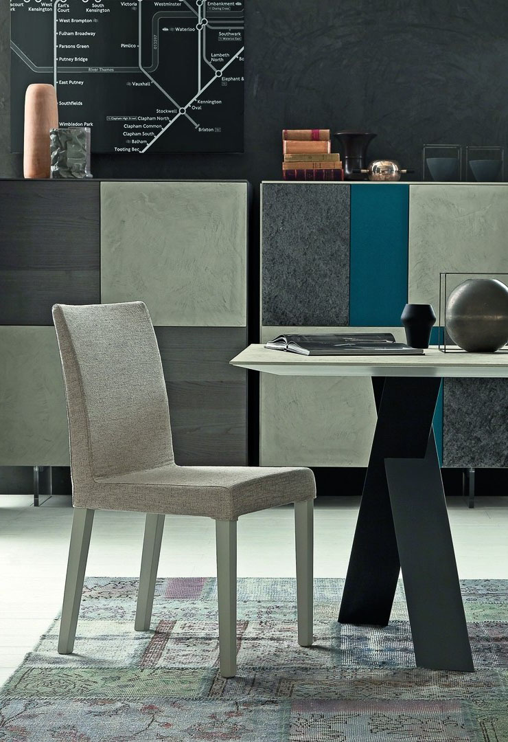 Practical, elegant, comfortable, the padded Flex chair has an upholstered seat in fabric or leather. It is equipped with a flexible backrest which inclines towards the rear for better comfort. The legs in solid ash wood and matt lacquered beech, painted metal with aluminum finish or chrome, ensure stability. The fabric of the Flex chair is completely removable for greater ease of use.