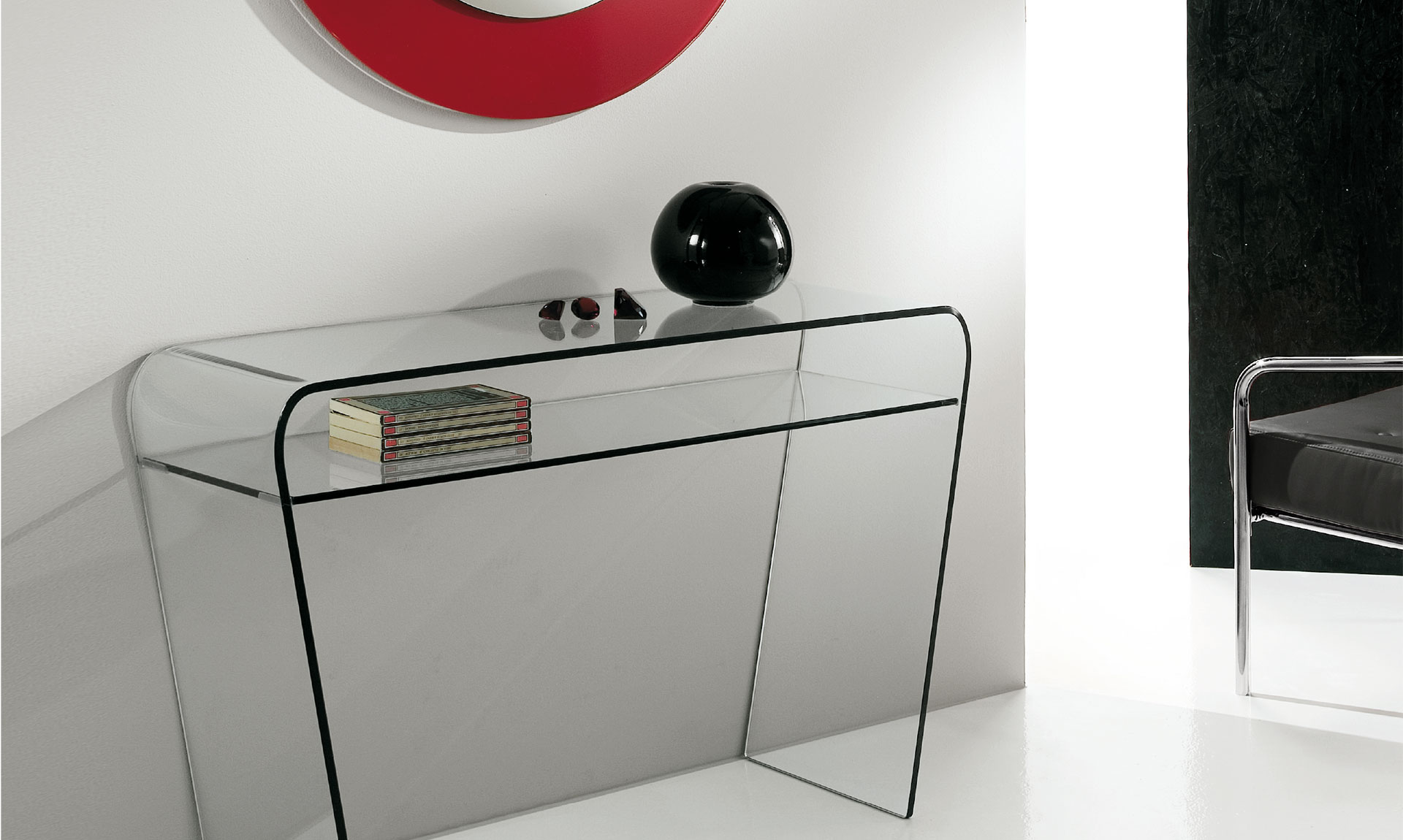 Saphiria is a console with a transparent, curved crystal top, with a sinuous and a discreet design embellished with a shelf in total crystal. Its light and luminous shapes make it an exclusive and original piece of furniture.