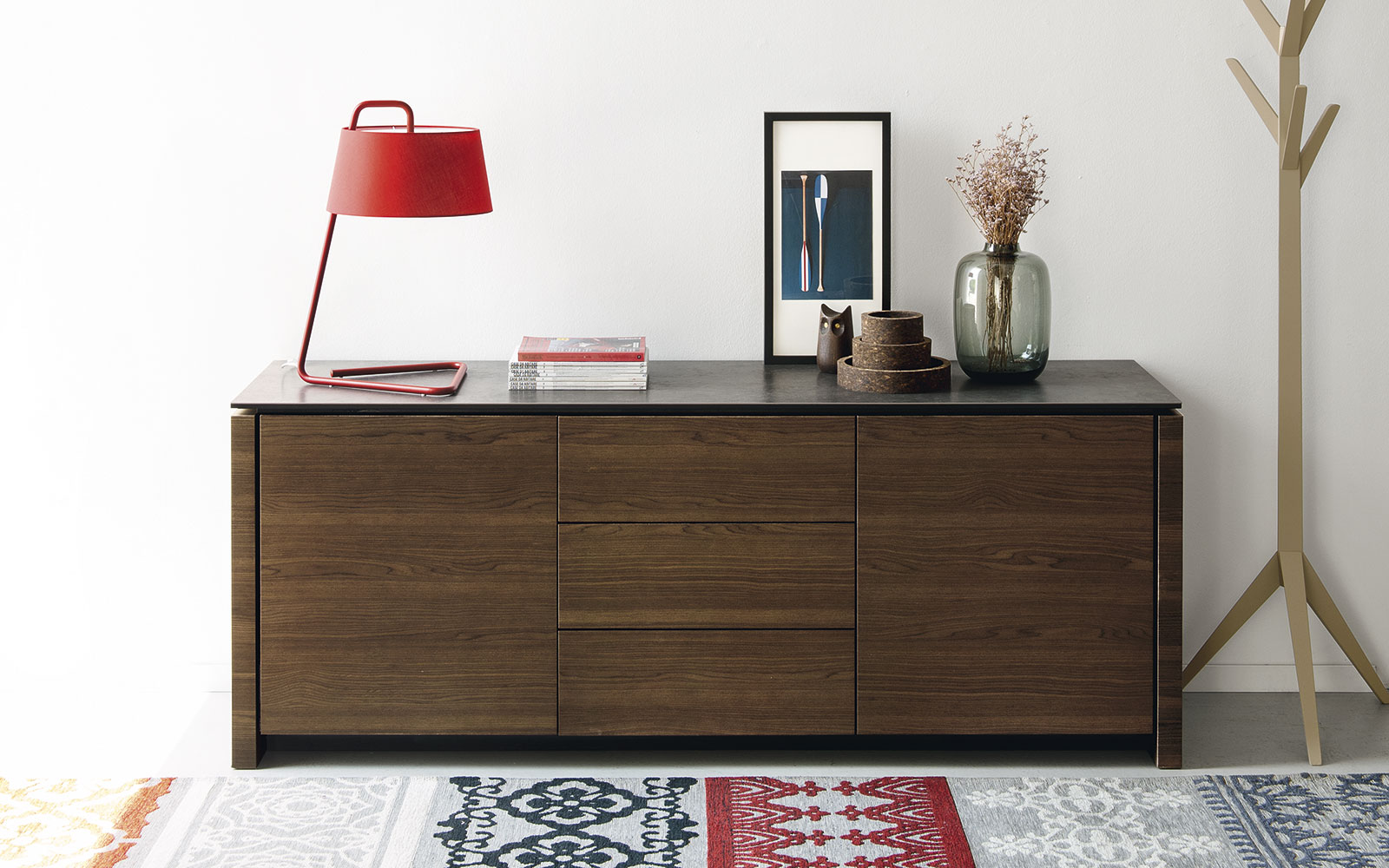 A wooden frame with two drawers and a central compartment. Mag is a modern wooden sideboard, essential and capacious, with a ceramic top, resistant to everything. It combines harmoniously with our tables. The two side drawers have no handles and open by means of a push-pull system. The central compartment, designed specifically to contain a decoder or DVD player, has hinge doors and comes with a tempered glass shelf and a practical cable hole at the rear. MAG is the perfect TV stand for a refined living area and a contemporary setting.