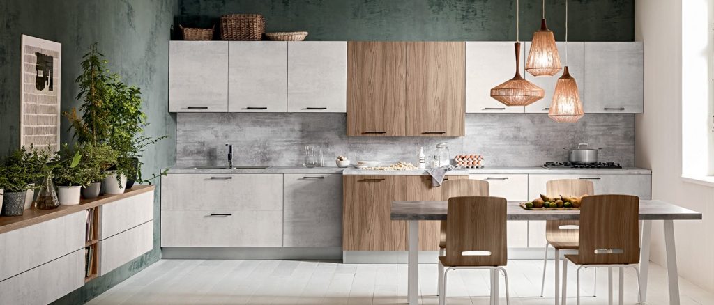 22, the new system to furnish your kitchen. Doors with a 22mm depth, new material finishes and elegant colour combinations to give a personal touch to your everyday space. 22 Plus, a door with an elegant cut at 35° on the top part, which confers a modern look and an easy grip to your kitchen.