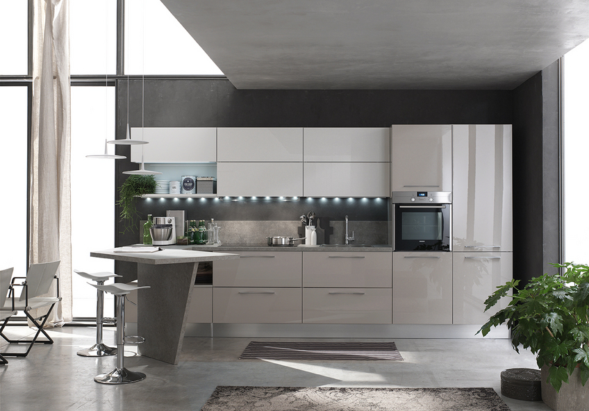 Your kitchen lights up with Silver. High technology applied to everyday life, respecting nature, in a variety of attractive, shiny and modern solutions. The Dialux gloss gives volume and movement to the surfaces, in an infinite play of reflections that visibly expand space when light plays upon them.