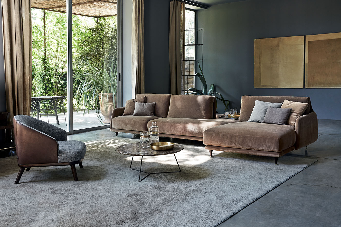 From the covered tray to the side chaise longue, the lines drawn by the soft central seats of this sofa seem to extend themselves, inspired by the slender support feet, towards the extremities, as if drawing an imaginary timeline of which Astor marks the starting point. A knowing look at trends of the past and a visionary study aspiring to current design trends.
