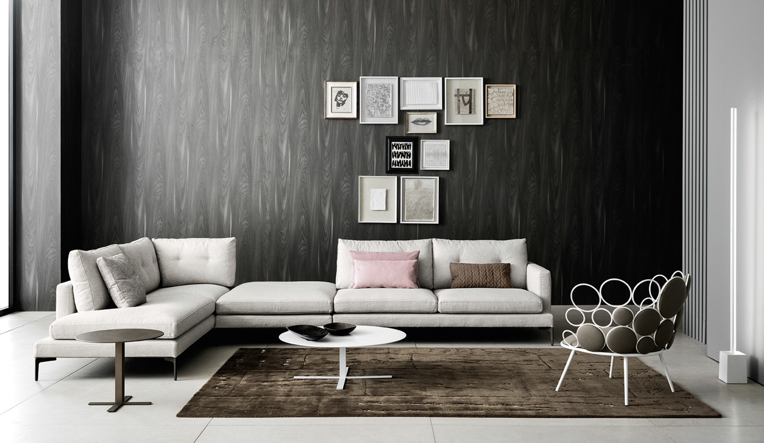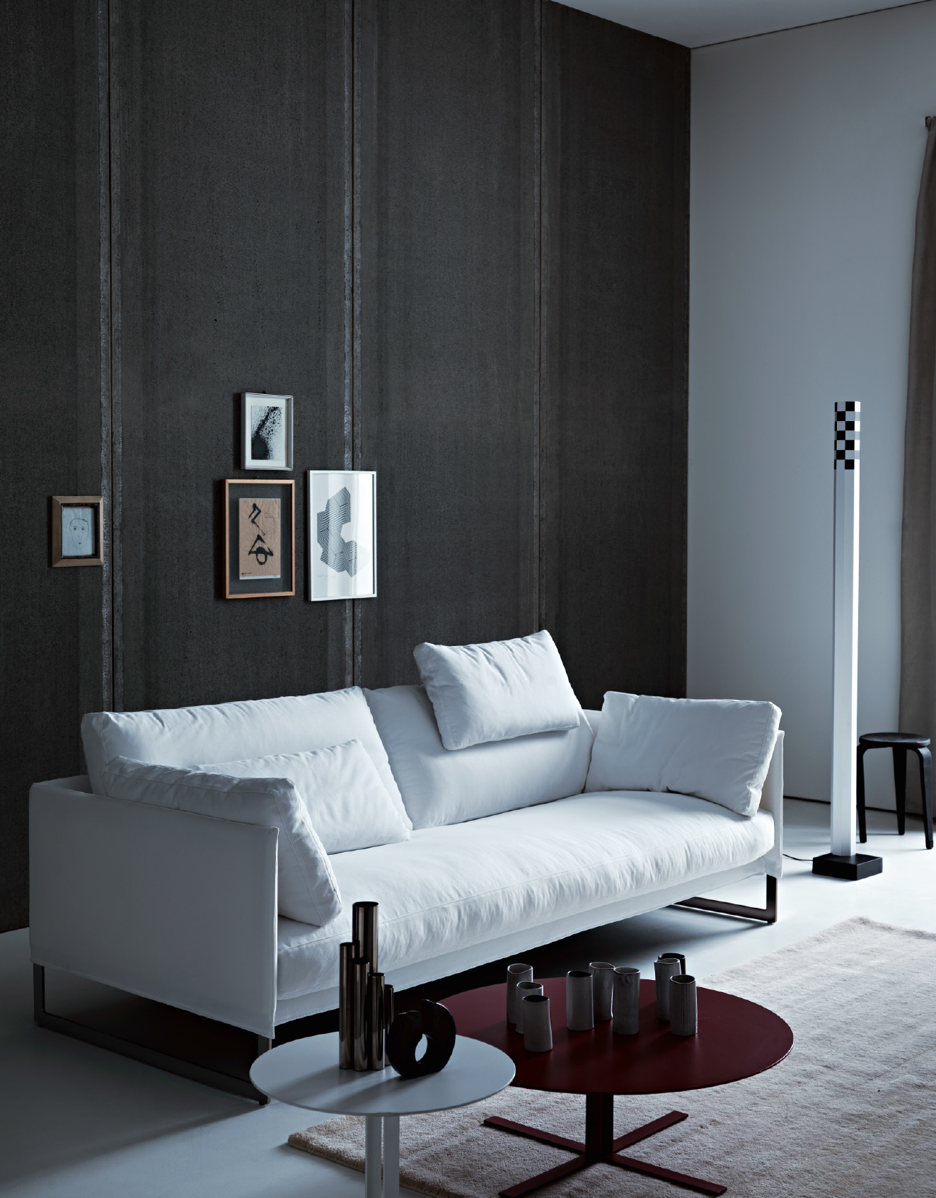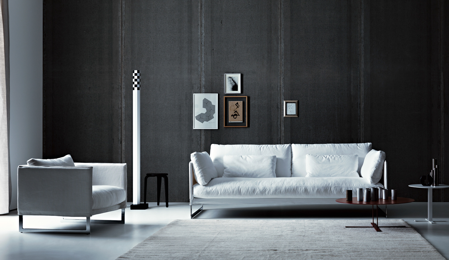 Livingston surprises you with an unexpected use of the headrest which, with a simple rotation gesture, becomes a comfortable backrest. It features an “intelligent” backrest coupled to a smaller cushion with simple hinges. The soft and informal seat communicates with an airy steel structure that gives impetus to the generosity of the cushions.