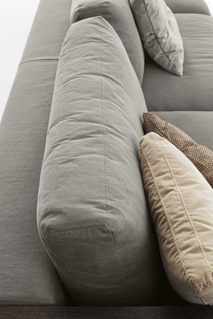 The seat cushions are padded with differentiated-density polyurethane foam, covered with polyester fibre. The back cushions are in polyester fibre mixed with washed and sterilized goose down divided into compartments and covered with 100% anti-feather white cotton fabric. The cylinder of the high back cushions, on the other hand, is padded with polyurethane foam, covered with resin-covered velvet.