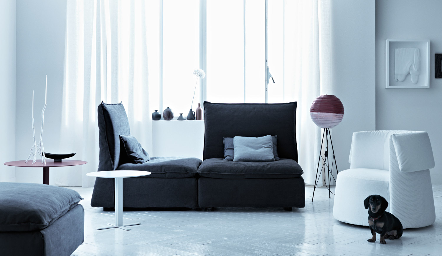 The Les Femmes sofa is therefore an excellent solution for those who want a dynamic piece of furniture. It also offers a great freedom of customization, thanks to the 3 different sizes of its modules, both central and lateral. Finally, the modular system is completed by a peninsula / chaise longue, a pouf and 3 armchairs.