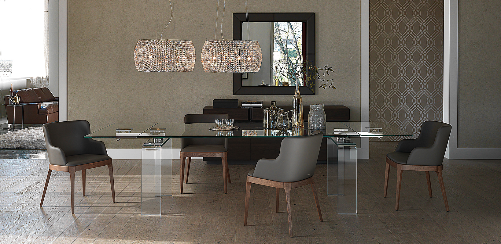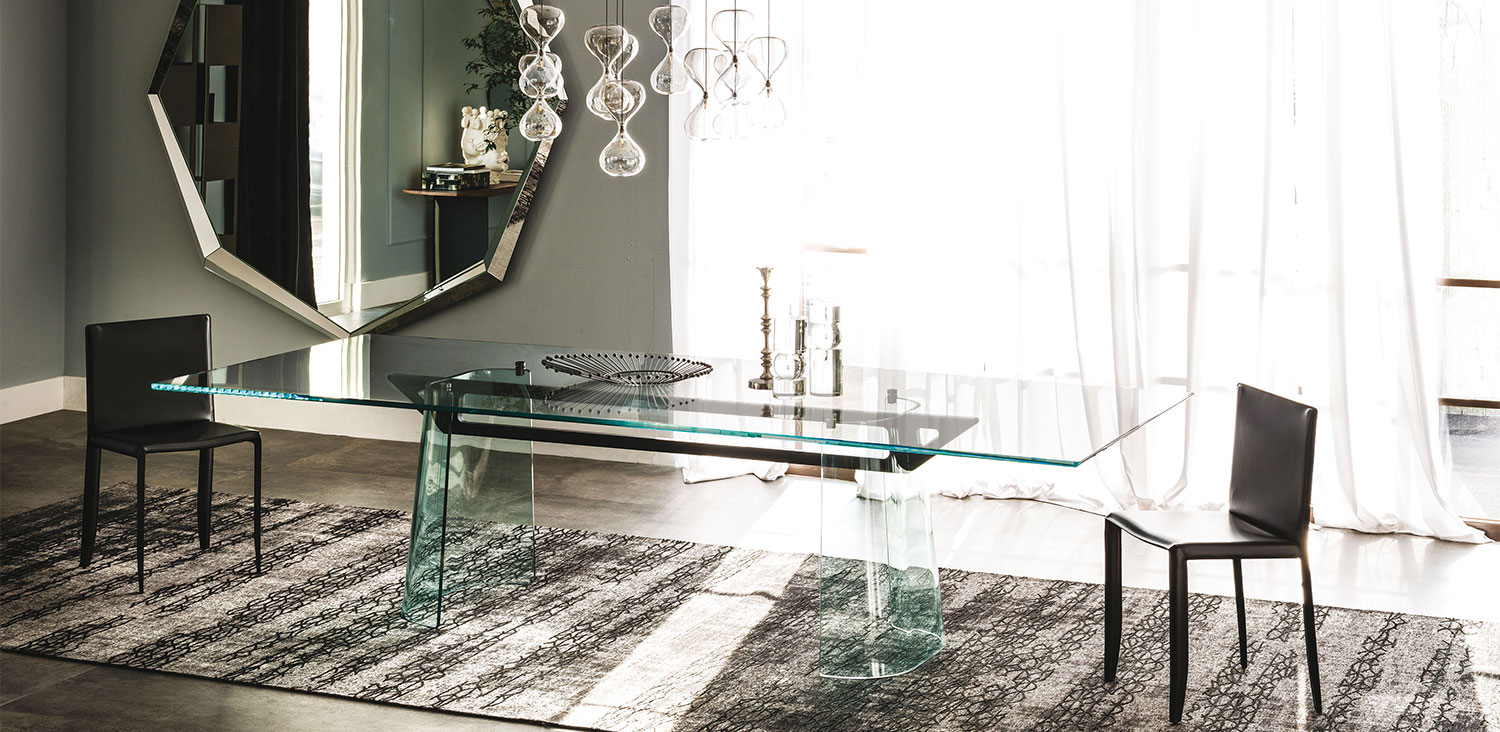 Extendable table with legs in curved transparent o extra-clear transparent crystal. Top and extensions in transparent crystal or extra-clear 15mm tempered crystal.