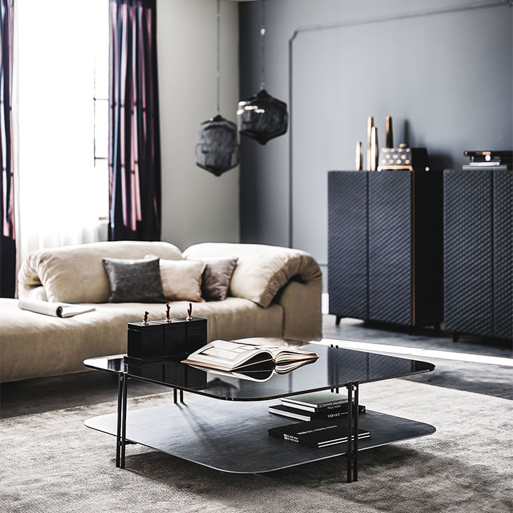 Coffee table with embossed black steel frame. Top in transparent or smoked crystal. Shelf in Marmi ceramic Calacatta or Ardesia. Bronze details.