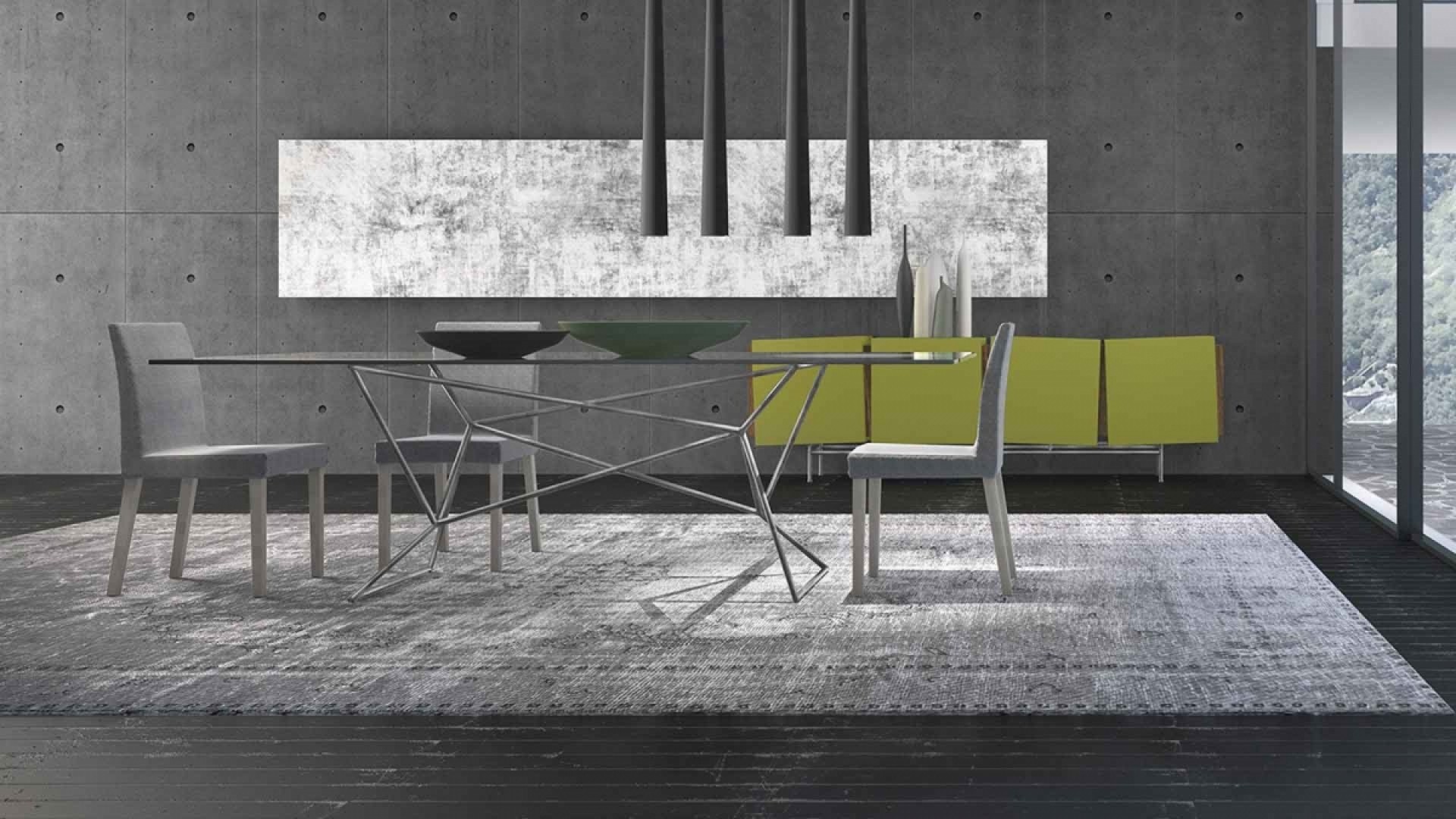 Web is a modern table in metropolitan style, an original, artful solution for the evolved habitat. The singular fixed tempered glass top, available in a transparent version or in elegant shades of gray, is enhanced by intersecting modern, soft iron symmetries, converging in the supports and giving lightness to the whole.